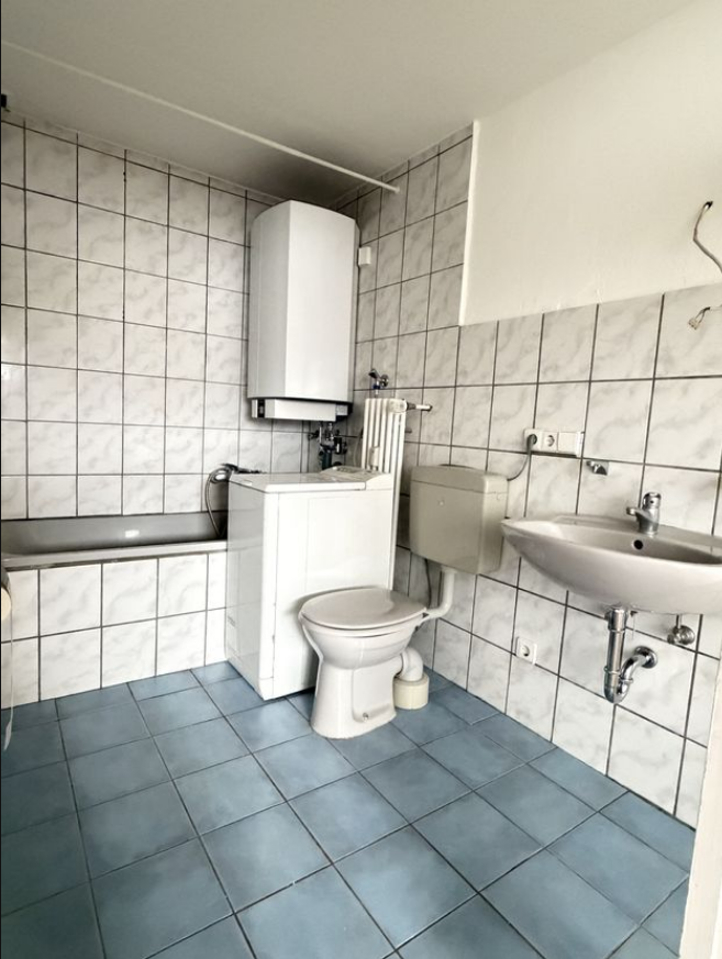 Das großzügig geschnittene Badezimmer ist vollständig mit Fliesen ausgestattet und bietet viel Bewegungsfreiheit.