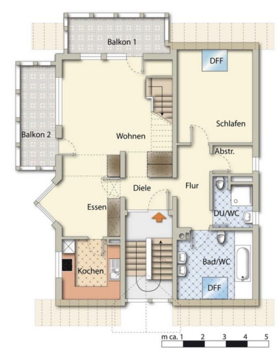 Im Gartengeschoss befindet sich eine großzügige 2-Zimmerwohnung, im Erdgeschoss eine 3-Zimmerwohnung sowie im 1. + 2. Obergeschoss eine großzügige 3,5-Zimmer Maisonette-Wohnung.